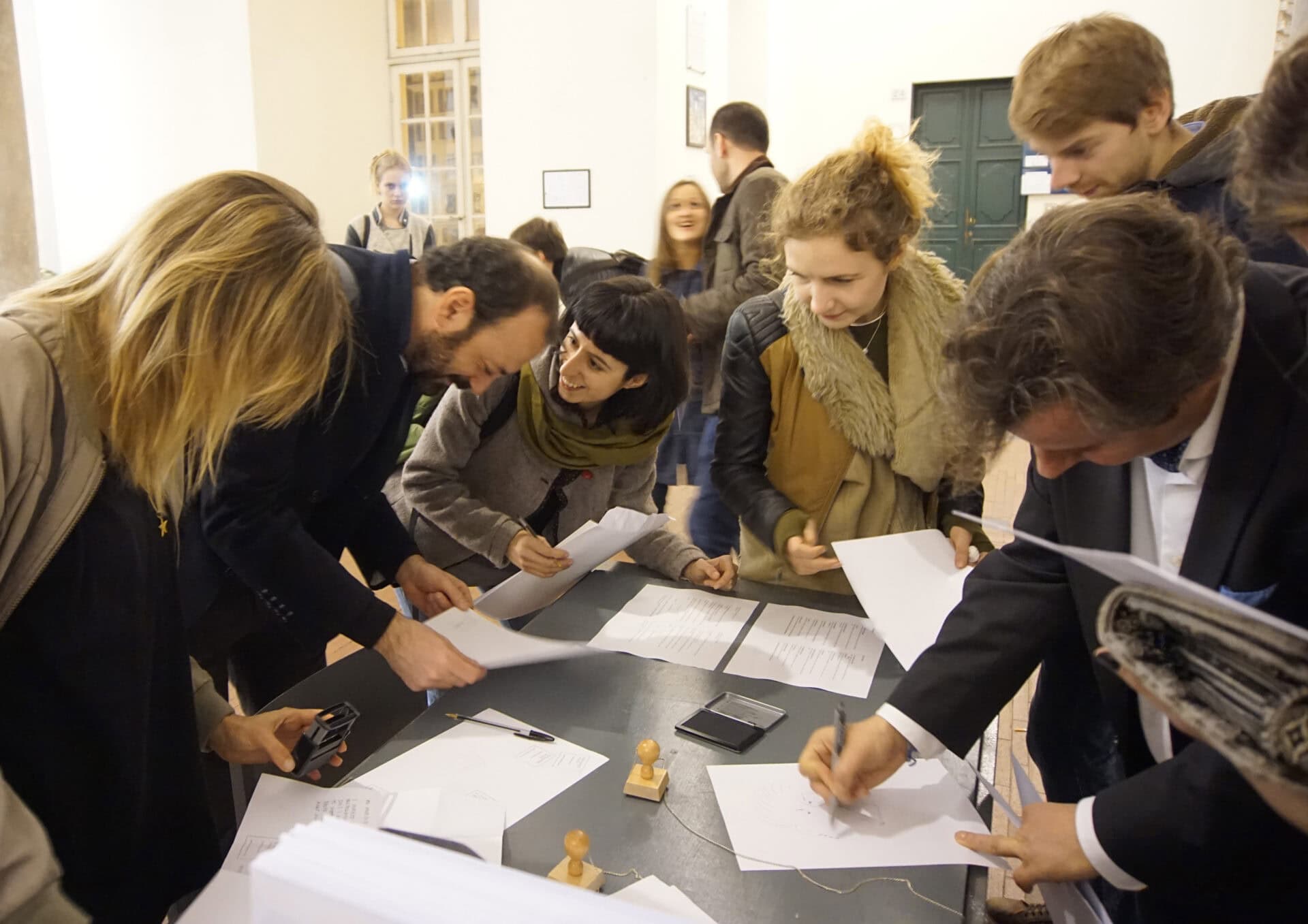 Exchange Value. Intercultural depicts a scenario reminiscent of an immigration office in Germany, where a protocol is filled out in order to “get a paper”. This protocol includes questions like: Write the text of a popular song from the place you come from, or describe how to behave while eating, etc. After doing this, participants are welcome to exchange their own paper for another one inside the archive, where there are many papers written by migrants living in different countries in Europe.