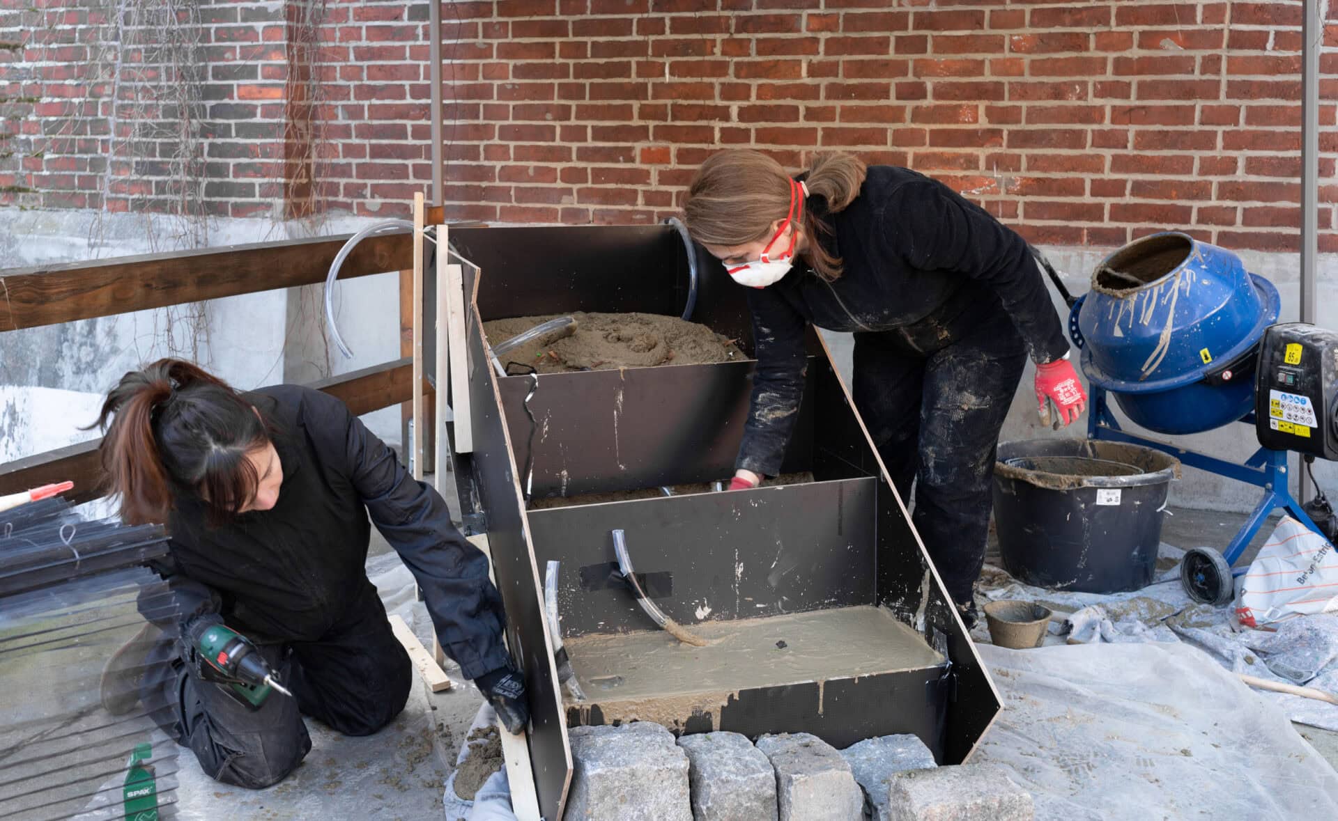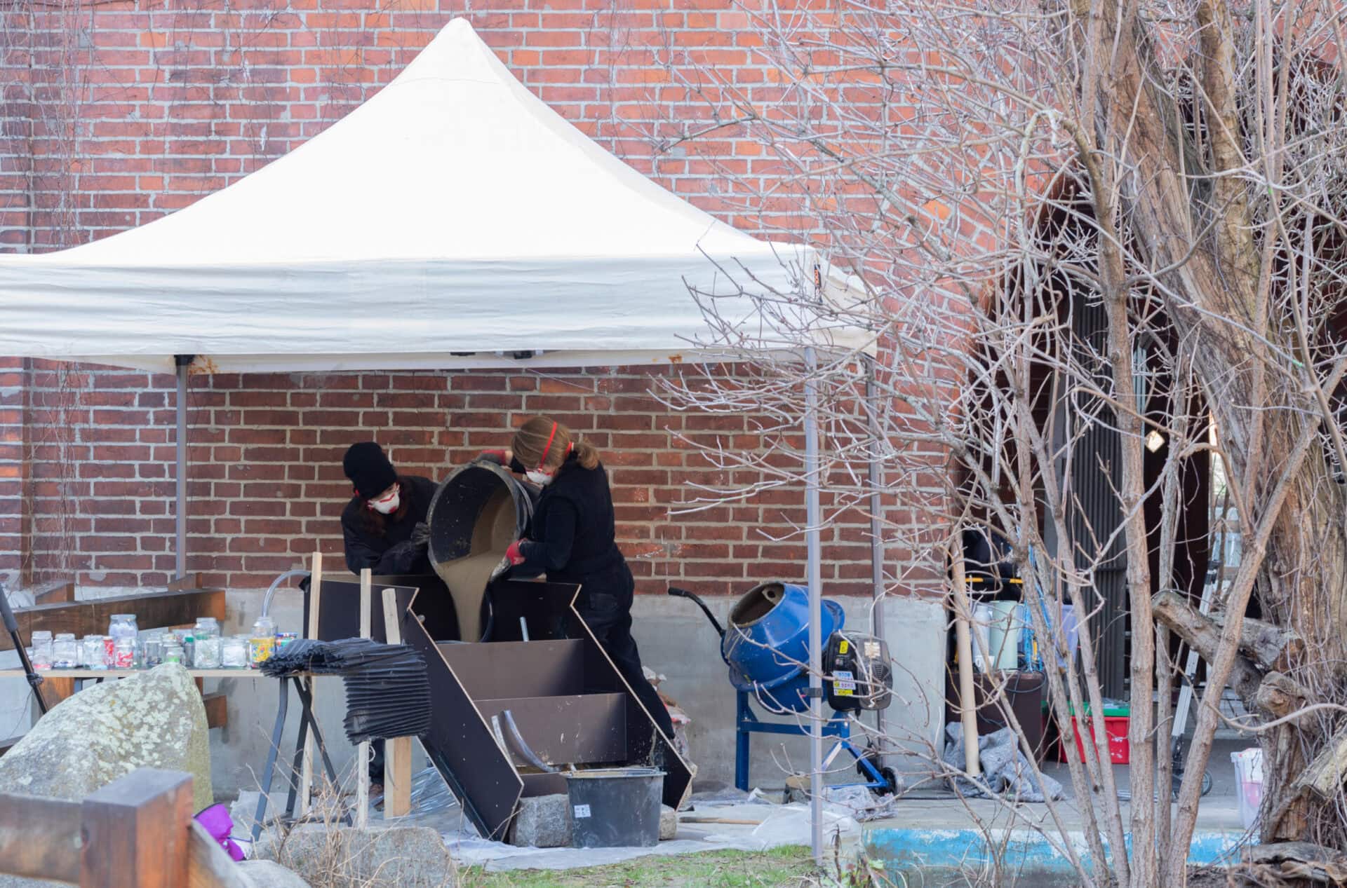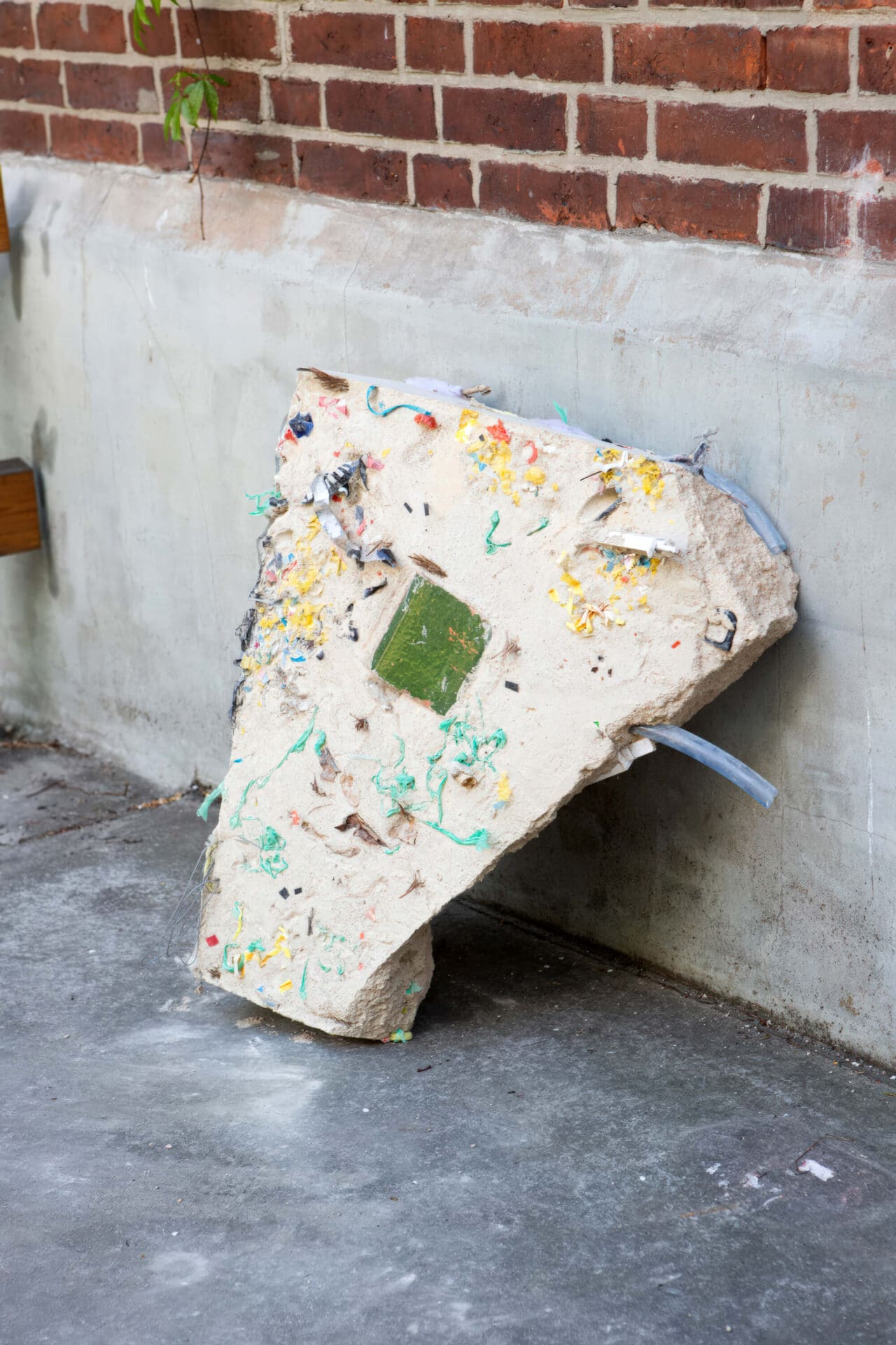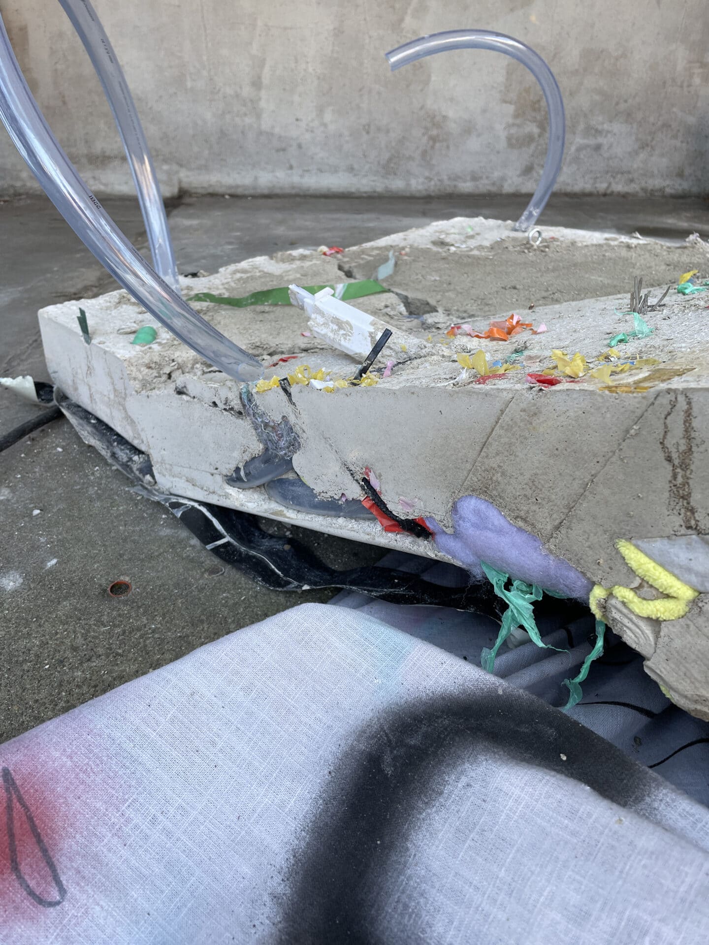 In preparation for the site-specific work, rainwater was collected from the Bärenzwinger to mix the concrete used for the sculptures. Alongside collected objects (such as natural fragments, urban waste and scattered trash found in and around the Bärenzwinger), this fusion solidifies their collaboration. A large conversational drawing is placed under and draped around one of the objects, waiting for the audience to read the private and public histories it depicts.