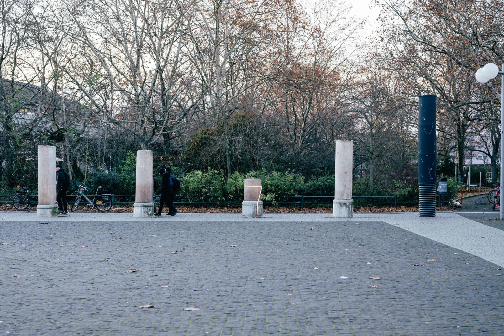 The original columns are remnants of a building which was destroyed by American bombers on February 3rd, 1945, during an air raid on the area. Their remains were resurrected and placed in their original location, intentionally to remember this moment of doom. Today, they shine in their incompleteness, differing in height, showing their scars in their granite surface.