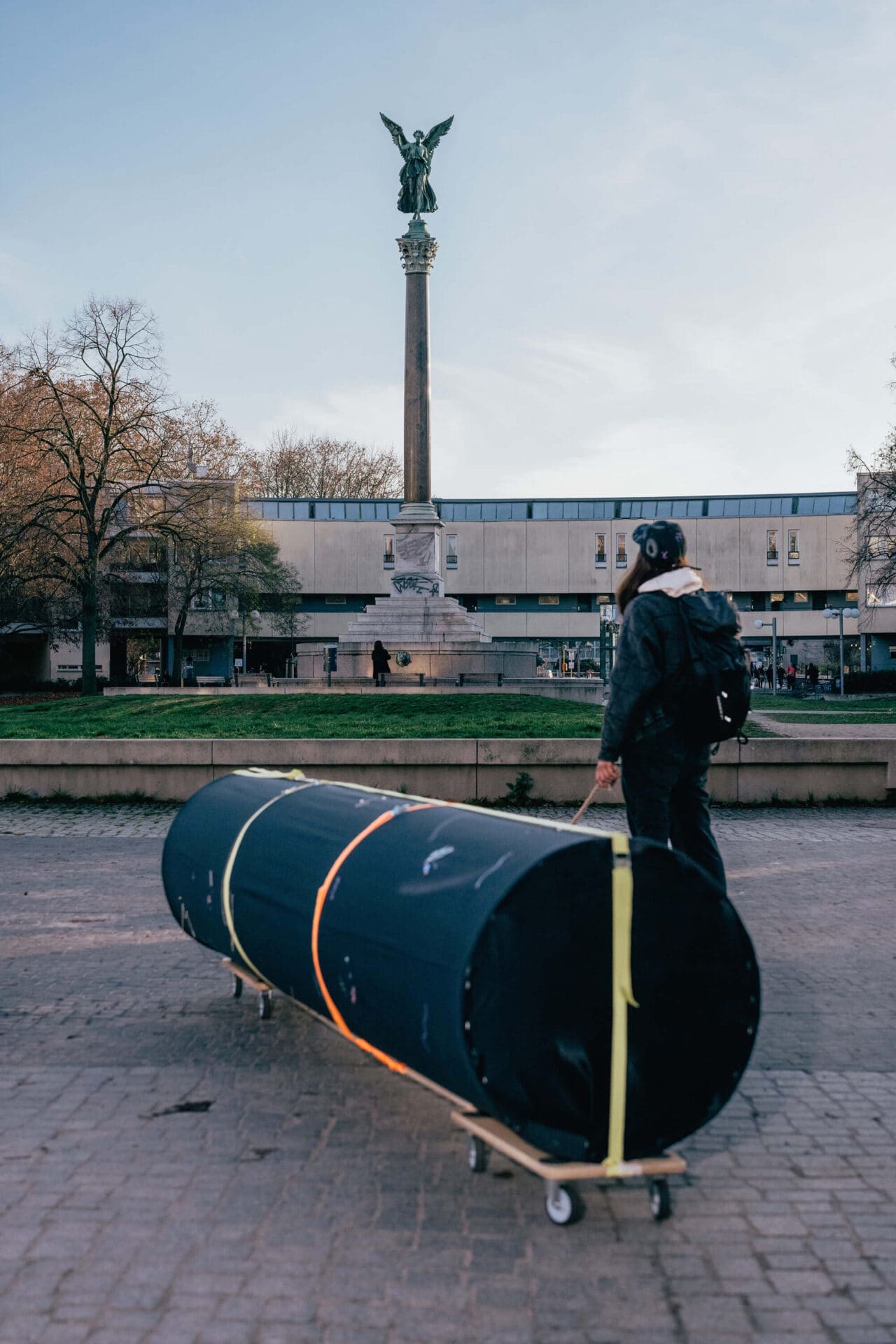 A cloudless sky stretches over the concrete cityscape, sunlight casting sharp contrasts on the urban fabric. Patricia Sandonis, wearing a cap decorated with shapes and ornaments, moves with intent, pushing and pulling a horizontal column through the busy streets. She is accompanied by a group of women. They are on their way to return the long, fabric-wrapped object to the place where it was first imagined.