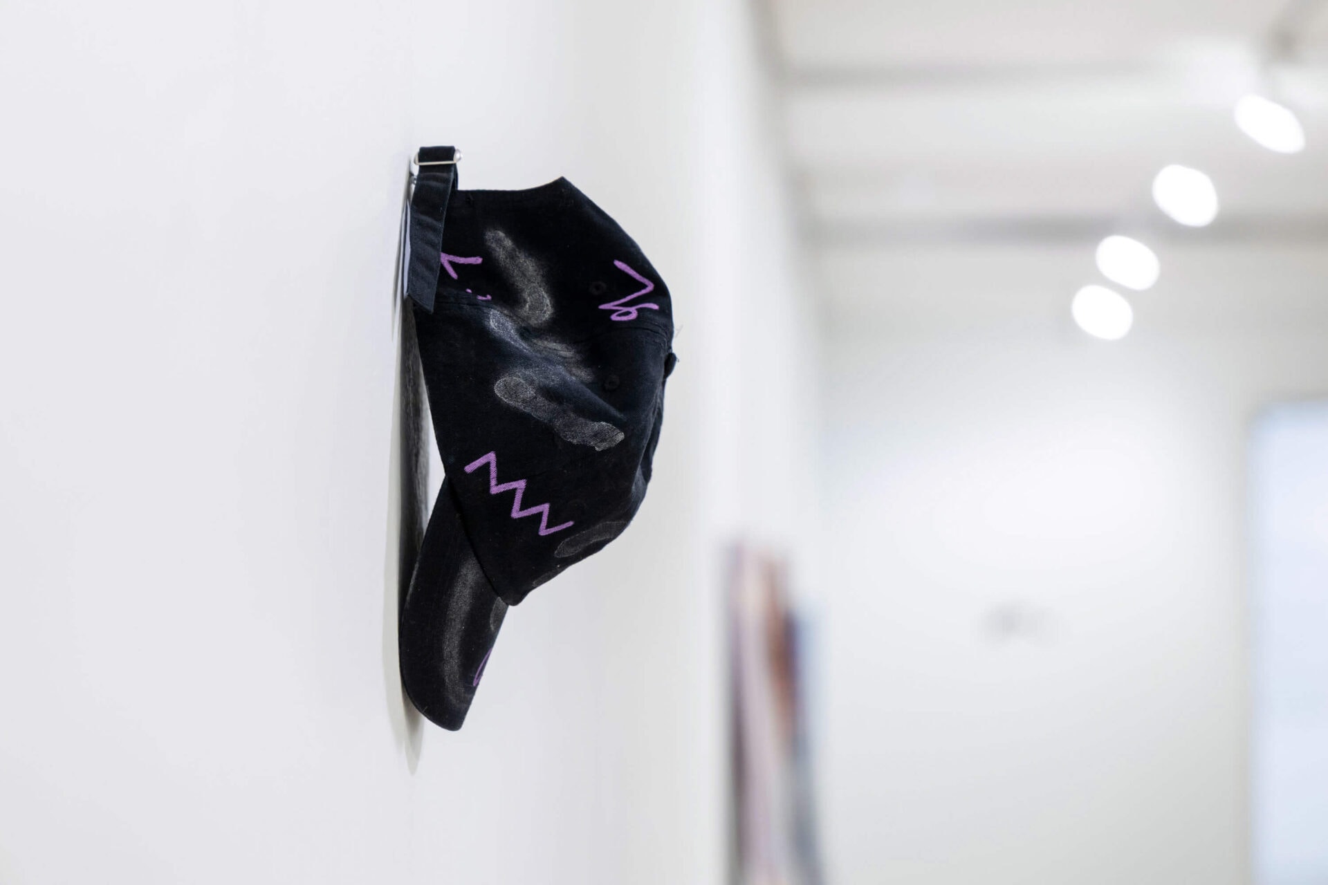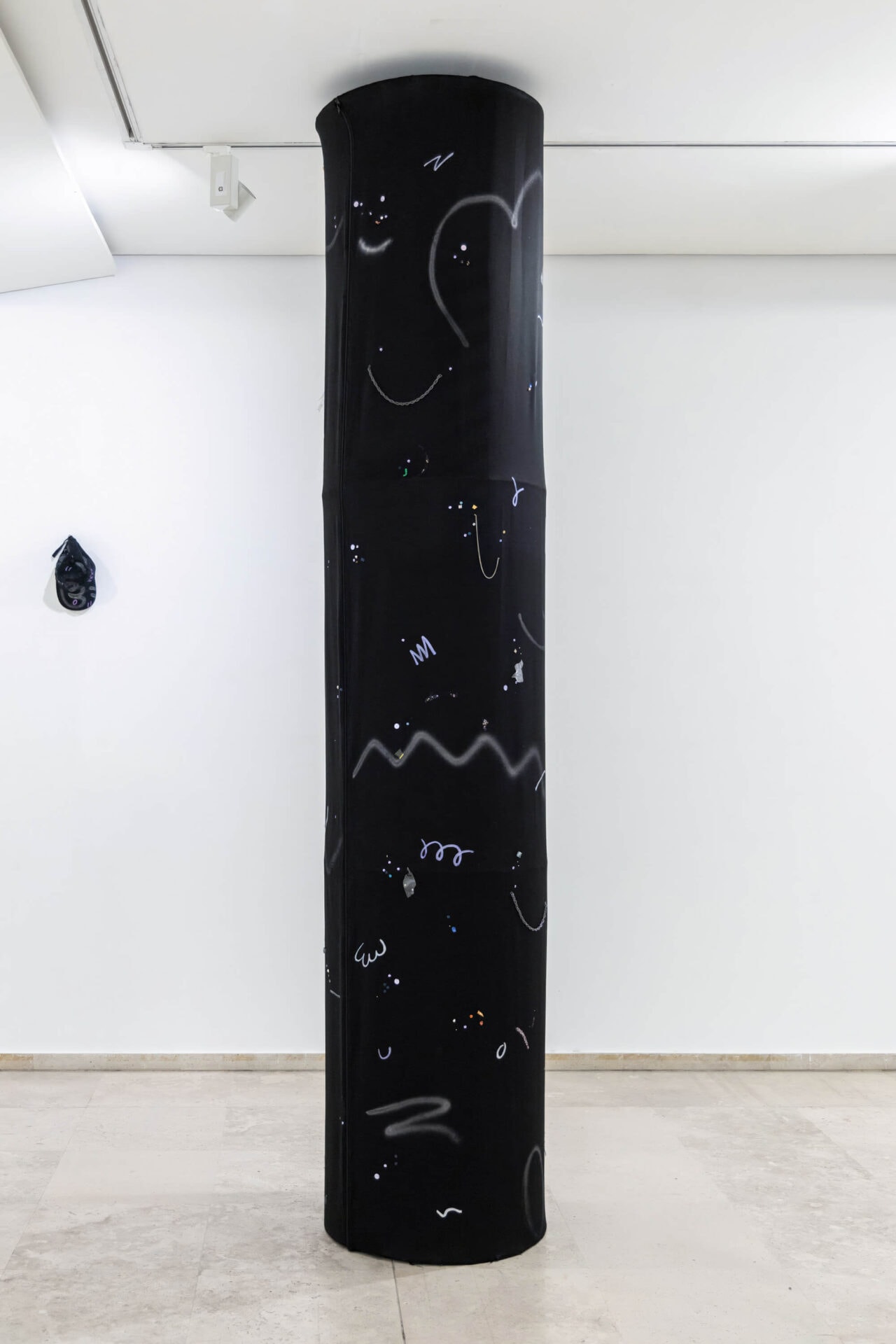 In the installation, she tries to complete these broken monuments again, through material speculation. One of the works is a leatherette half-cylinder, hugging its counterpart with a strap. The highest of the four, consist of a black plastic base, and a black fabric that the artist has decorated with contemporary ornaments like chains, fragments of patterns, lines, geometric shapes, and sequins. The lowest pillar of all is a clear transparent round, flat circle made from found and processed fragments and remains such as pulverized beer bottles, plastic remains and confetti.