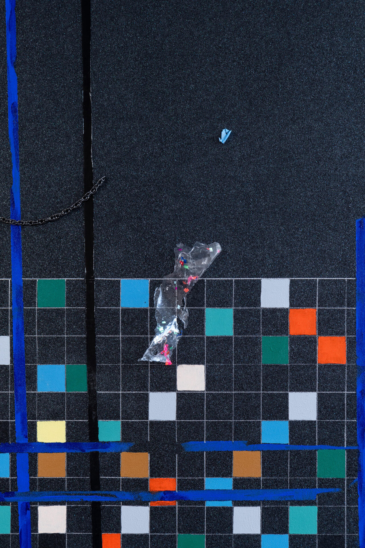 The paintings are displayed on black-painted construction-site fence stones. These heavy plinths act as ‘feet’ for the canvases, giving them a sense of mobility and autonomy while connecting them to the materials they reference and further emphasize the dialog between infrastructure and impermanence.