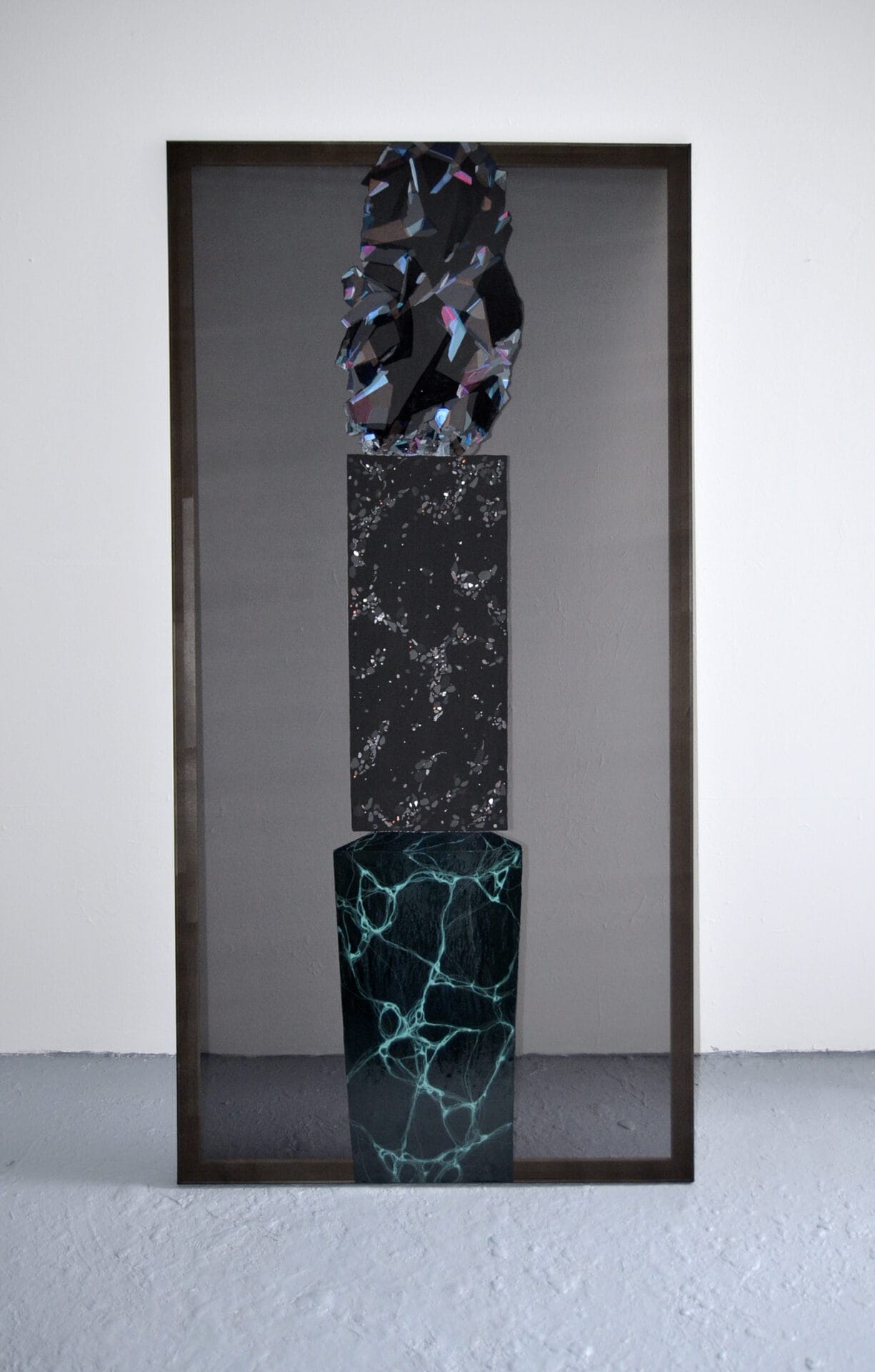 On the ground, next to the necropolis rests appears a conglomerate of plastic and resins that form a new material, a kind of plastic-granite that makes us think of the unnatural resources that future generations of the earth will obtain.