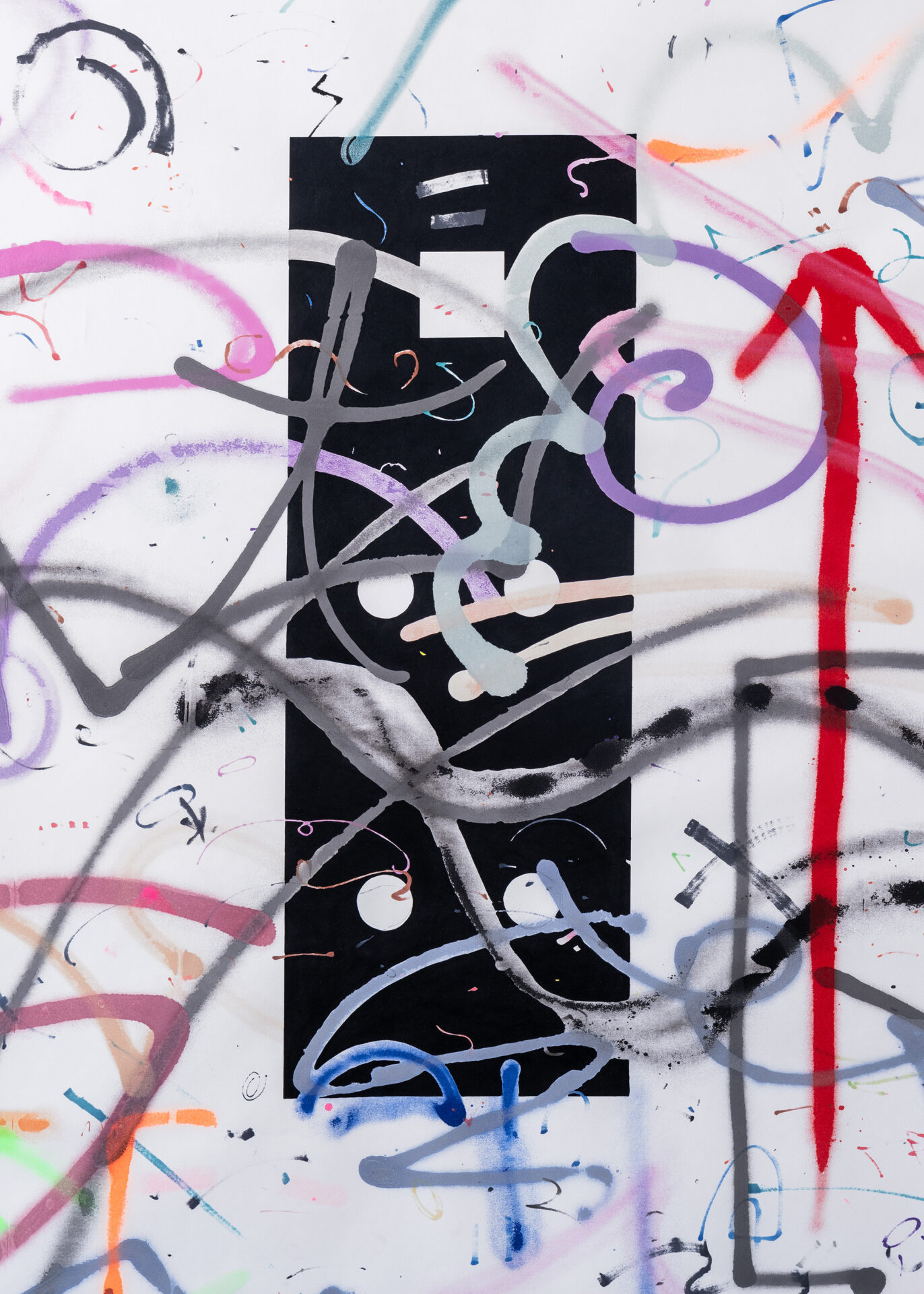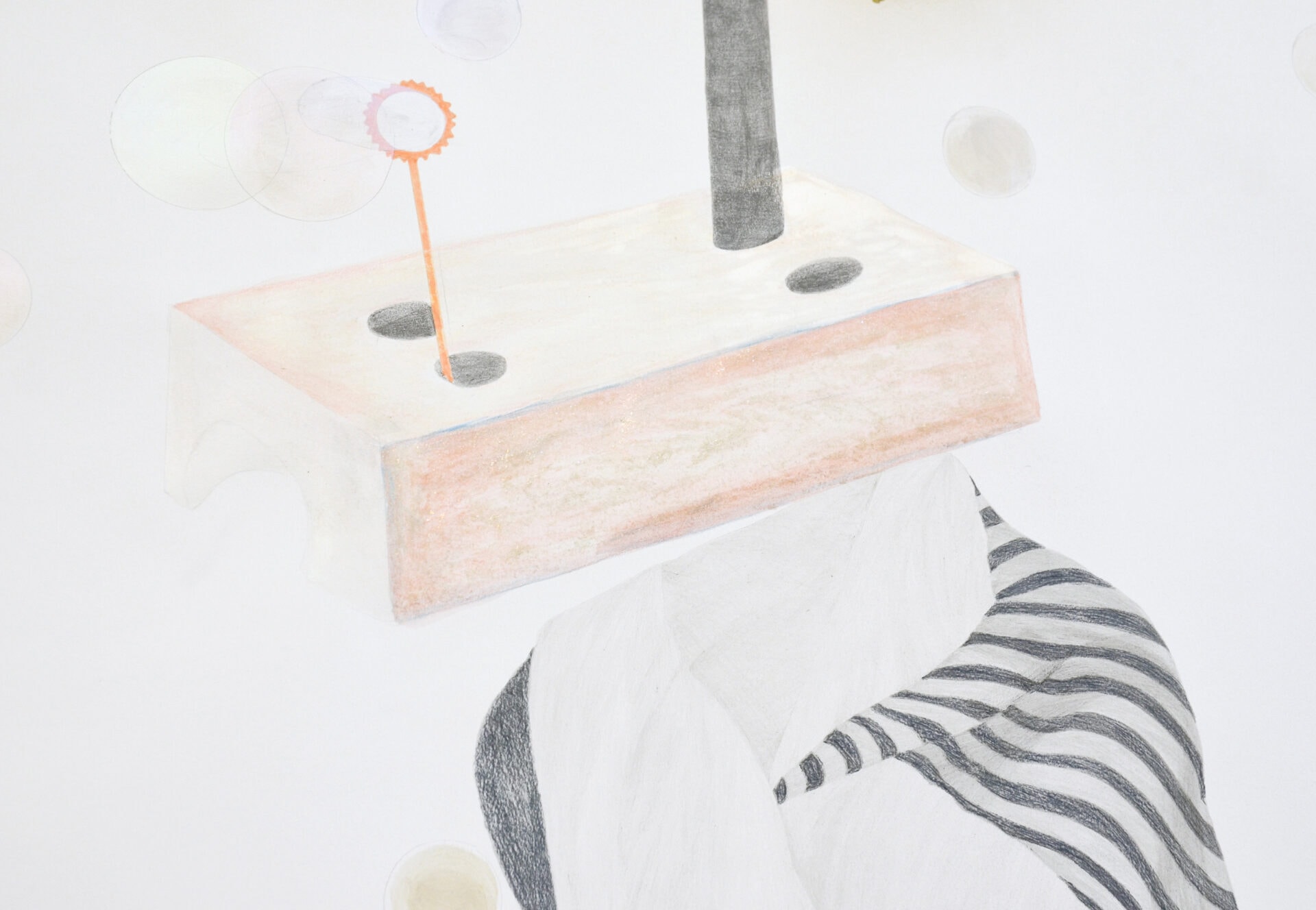 A painting-sculpture in the shape of a Europe-flag-blue column is shown suspended in the air, without a base or capital, without stability and without holding anything. Painted fragments represent the sea, signs of prohibition, lifebuoys, confetti, a piece of a metal fence and glitter.